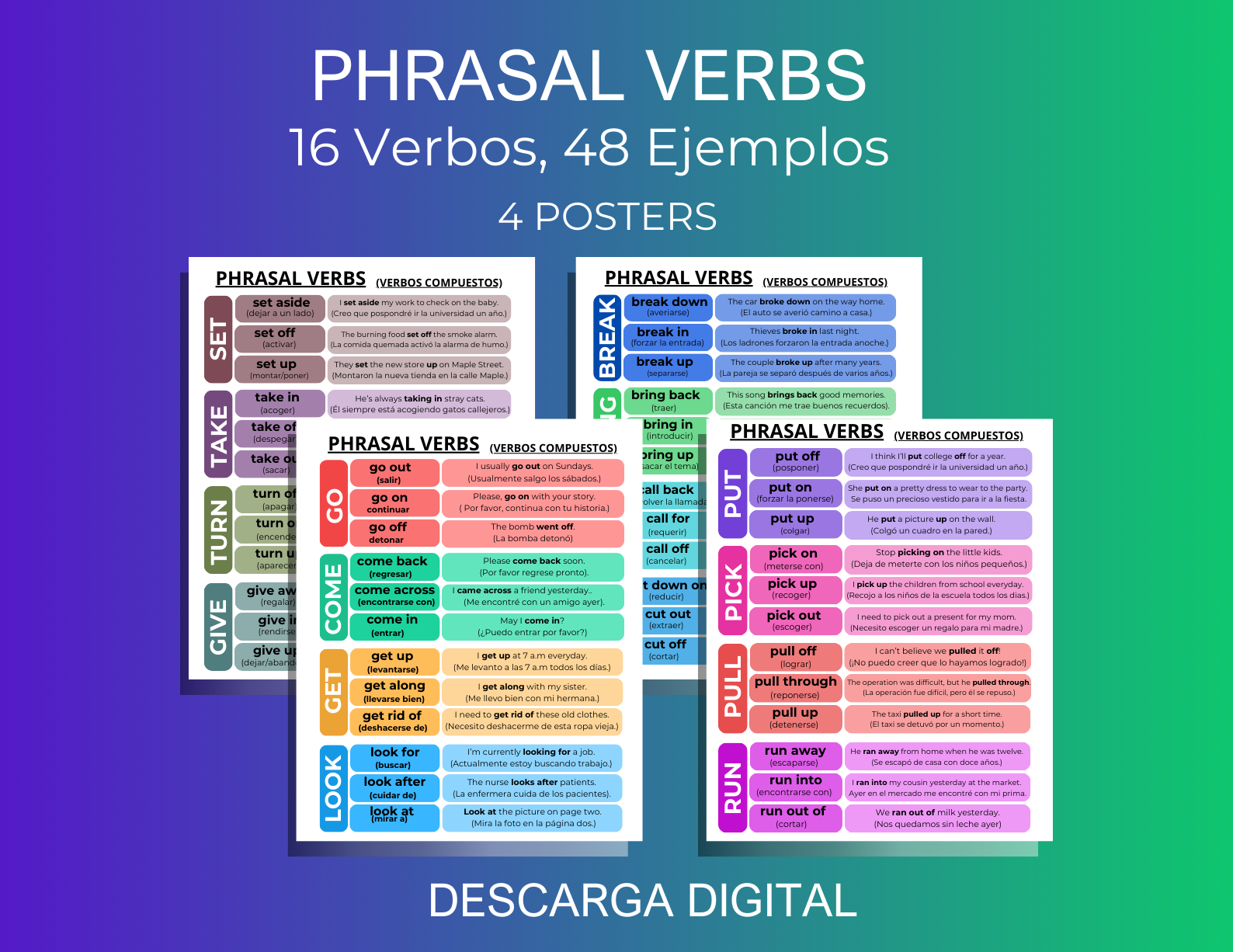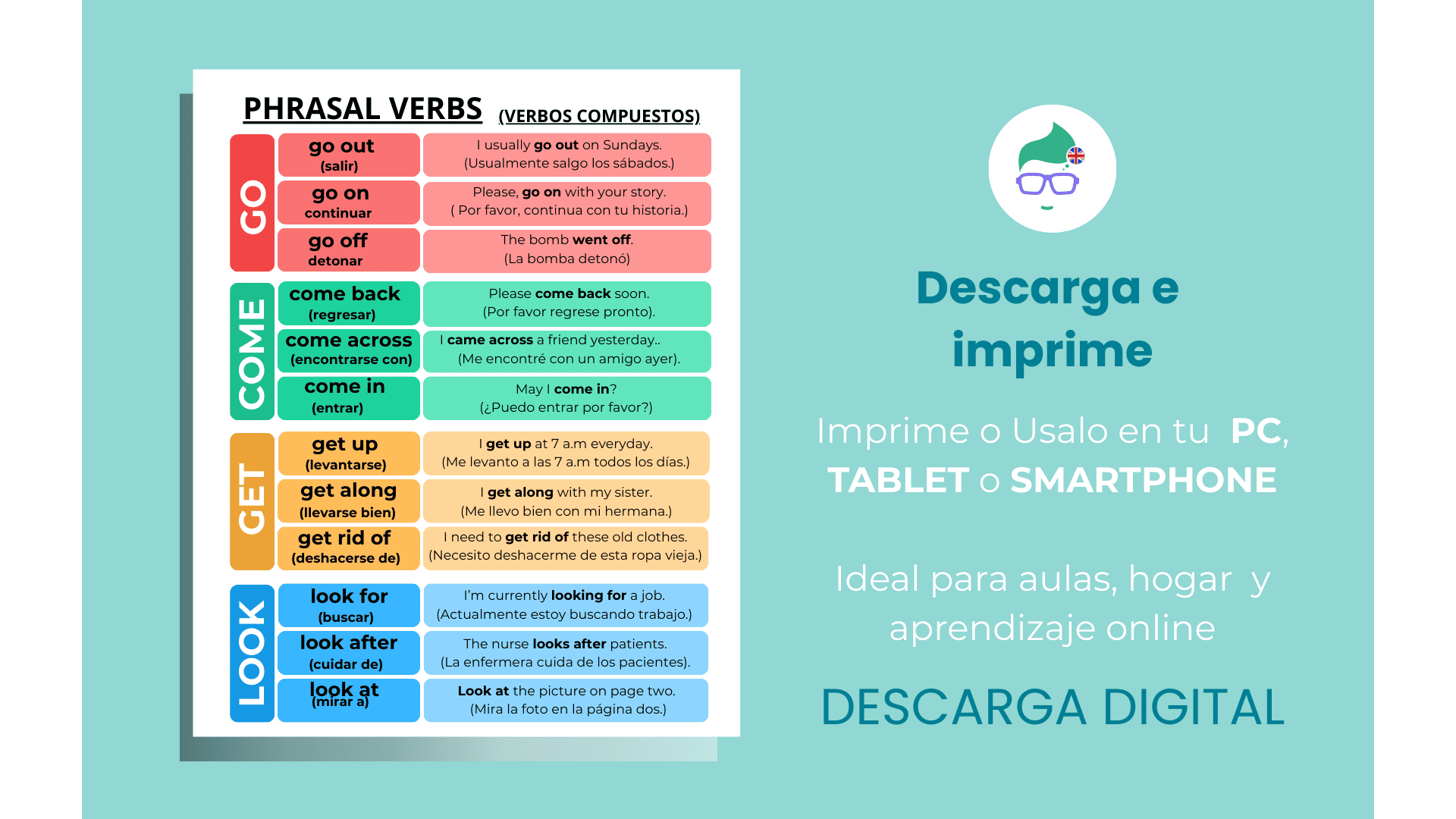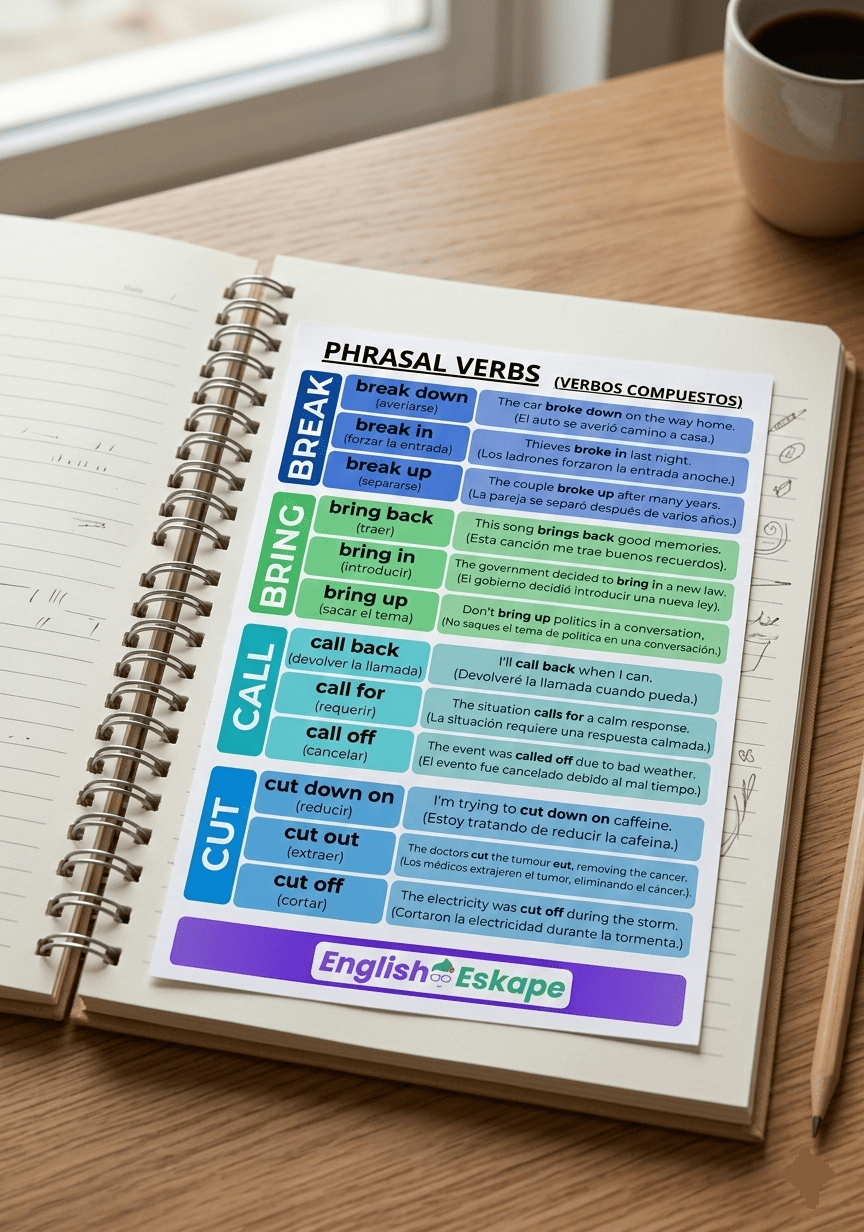 Lo que obtienes: Una hoja de referencia rápida con los verbos compuestos más utilizados en el día a día.